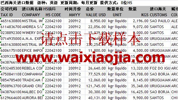 巴西進口、出口提單數據,以巴西本土企業向全球 200 多個國家和地區進口各類商品的提貨單為依據。按照具體產品的精確 HS 編碼提供。 內容包括:貿易方向(進口、出口)、巴西進口商企業、各國出口商企業、 HS 編碼、產品描述、提單描述、貿易方式、產品重量、數量、數量單位、總金額、集裝箱尺寸、抵達港口、到港日期、月份、中轉國、中轉港口、原產地、國際港口名稱、船公司、代理公司、通知人等信息。