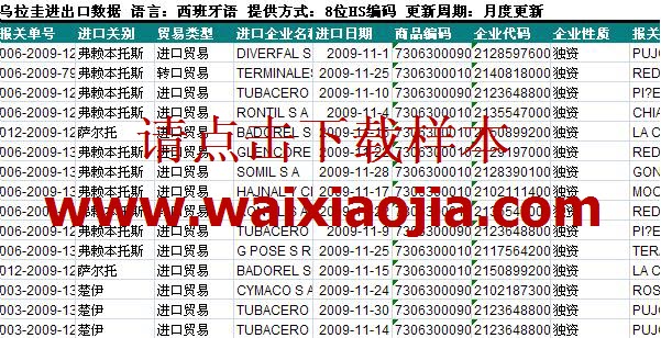 烏拉圭進口關單數據,以 巴拉圭 本土企業向全球 200 多個國家和地區進口各類商品的進口申報單證為依據。按照具體產品的精確 HS 編碼提供。數據內容包括:貿易類型、 關單號、通關日期、進口商代碼、進口商名稱、進口商地址、電話、原產國、貿易國、通關口岸、 FOB 總價、 CIF 總價、數量、數量單位、 CIF 單價、千克凈重、千克毛重、保險費、運輸費、運輸方式、運輸公司、出口商、海關編碼、產品描述