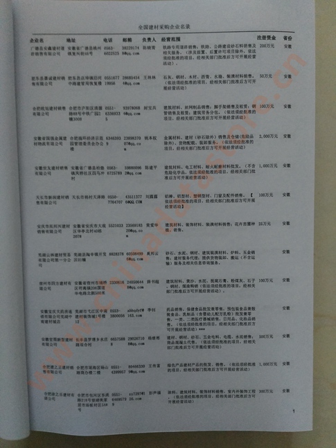 2024年新版中國建材采購企業黃頁,收錄了全國各地經營范圍涉及建材產品的貿易企業,這些都是頗具實力的建材產品的中國采購商。黃頁內容包含:企業名稱、地址、電話、傳真、郵箱、經營范圍、省份、注冊資金等信息。該套黃頁包含一個黃頁光碟加一冊紙質書刊,全國價格:1500元,省/直轄市價格:400元,城市價格:200元,共收錄了全國各地大概111371(統計日期:2018.1)家建材產品采購企業。黃頁光碟中是EXCEL格式,信息可任意修改、復制、打印、導出及導入到傳真、郵件群發等軟件中,無任何限制。