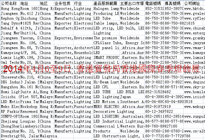 簡介:2014年香港貿發局展會會刊共收錄30個展會參展商信息。數據格式EXCEL,會刊內容包含:公司名稱、地址、地區、業務性質、行業、產品服務范圍、出口市場、電話、傳真、網址。