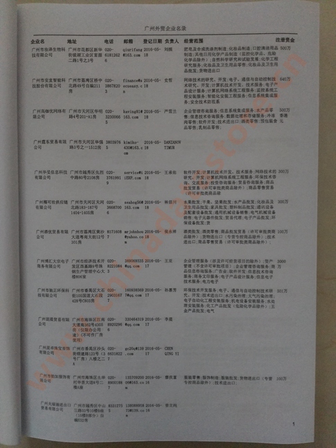 廣州外貿企業黃頁包括:外貿企業名稱、地址、電話、傳真、郵箱、經營范圍、注冊資金等信息。