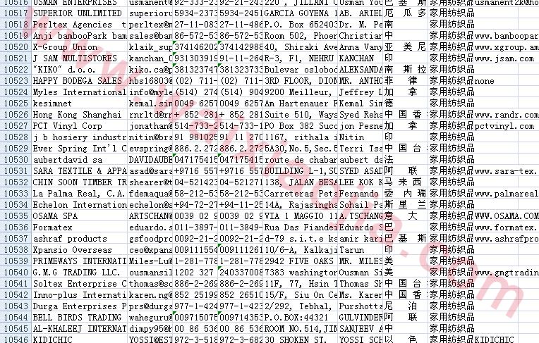 家用紡織品采購商名單數據為Excel格式,信息可任意修改、復制、打印、導出及導入到傳真、郵件群發等軟件中,無任何限制。