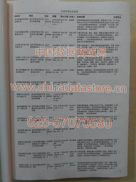 最新江蘇外資企業黃頁數據涵蓋了江蘇外商獨資企業、中外合資經營企業以及港、澳、臺資企業,包括江蘇臺資日資企業黃頁,江蘇外企黃頁具體內容包括:企業名稱、地址、電話、傳真、郵箱、經營范圍、注冊資金等信息;江蘇外資企業黃頁里面的企業都一些中外合資的大企業,這些公司經濟實力都比較雄厚,出口產品也比較多,業務范圍都比較廣,跟他們開展業務往來都比較容易;有了江蘇臺企日企黃頁開展業務也有了針對性,也省去了盲目去尋找客戶名單而浪費的時間了,工作效率也會有很大的提高.歡迎需要的客戶及時聯系我們!