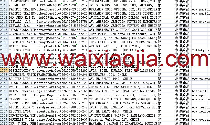 智利采購商名單數據為Excel格式,信息可任意修改、復制、打印、導出及導入到傳真、郵件群發等軟件中,無任何限制。